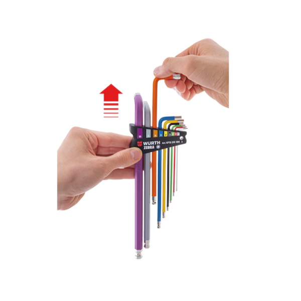 - Würth-kleurcode met poedercoating op de L-vormige sleutels en kunststof houder